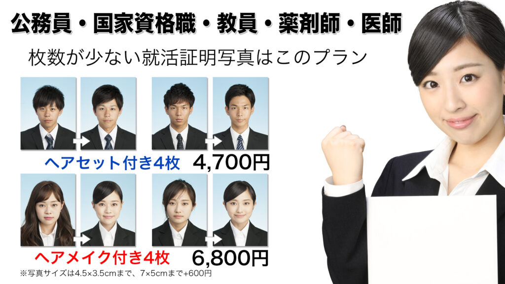 公務員試験・教員・薬剤師・医師・警察・消防等国家資格用証明写真京都写真館フォトハヤシスタジオ。
