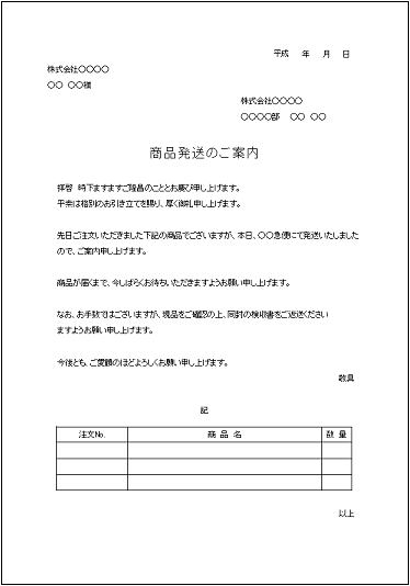 商品発送案内状テンプレート - Excelフリーソフト館 - 無料テンプレート集。