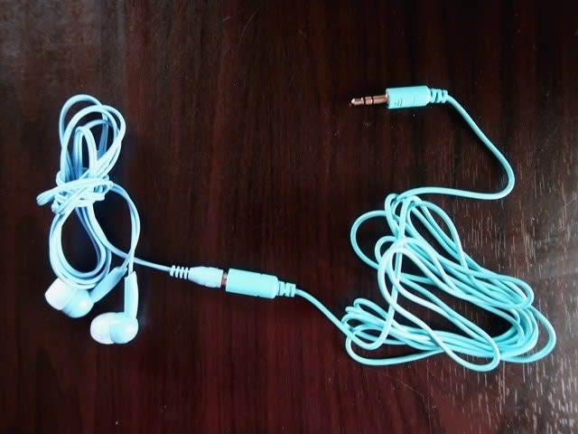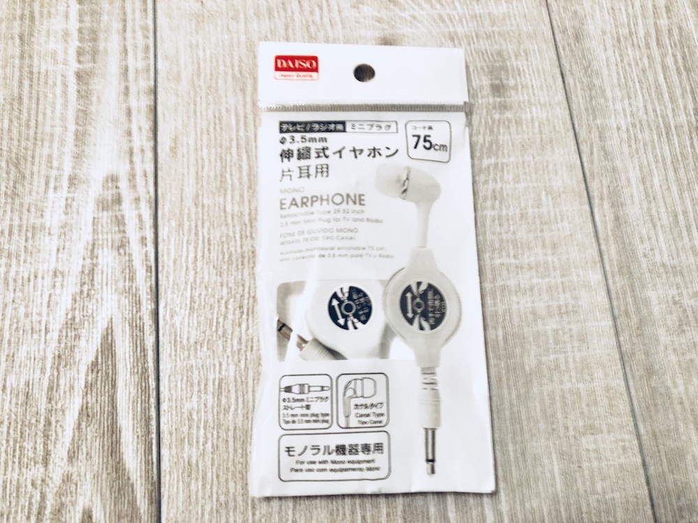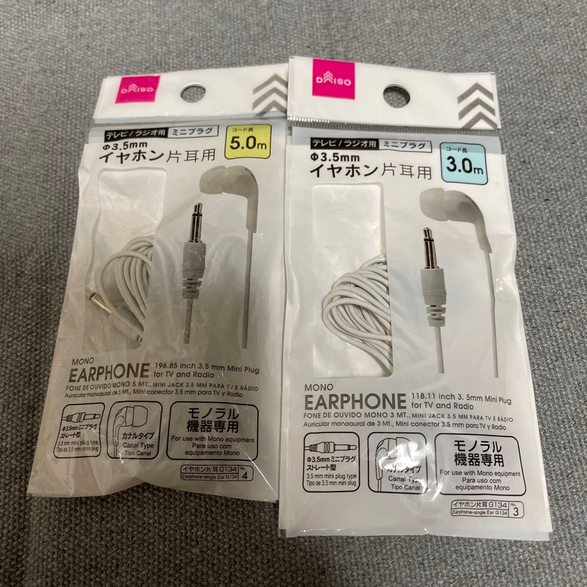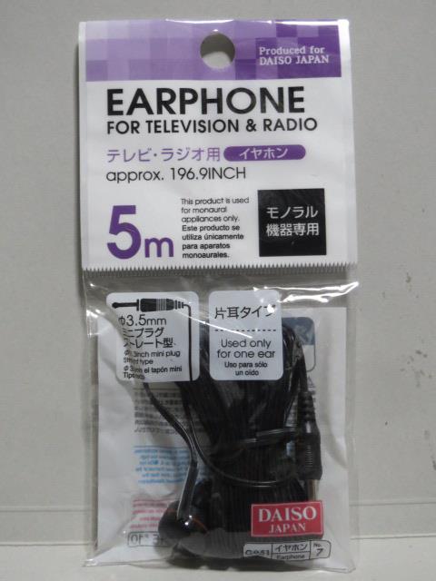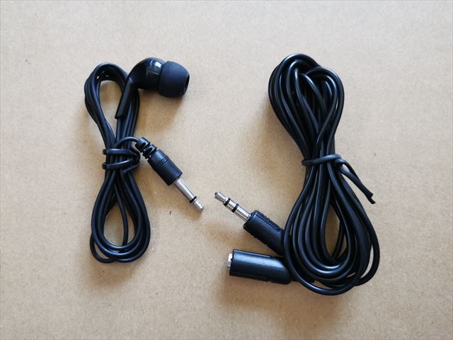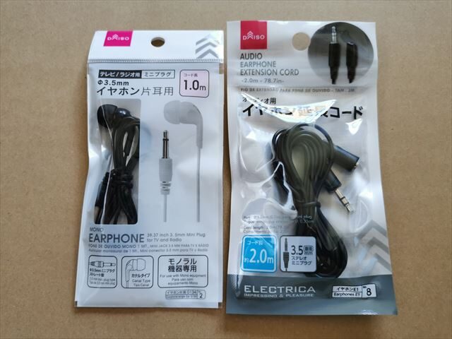 100均 ダイソーの片耳用イヤホンと延長コード。テレビ用にはよい。寅さん亭日乗。