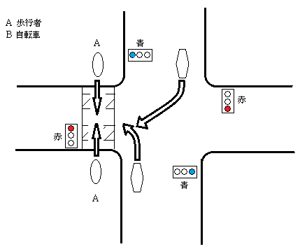 過失割合青色信号で横断歩道を直進する自転車とその右側から交差点を左折した自動車の接触事故。