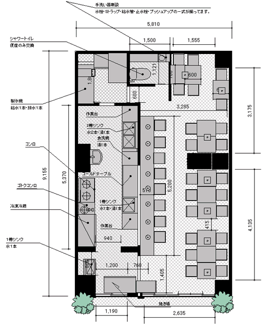 業務用厨房設備レイアウトソフト「厨房プランナー」の図面サンプル。