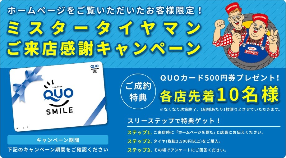 クオカードプレゼント!?スタッフ日記ミスタータイヤマン 古市タイヤ、カー用品ショップ ブリヂストンのタイヤ専門店。