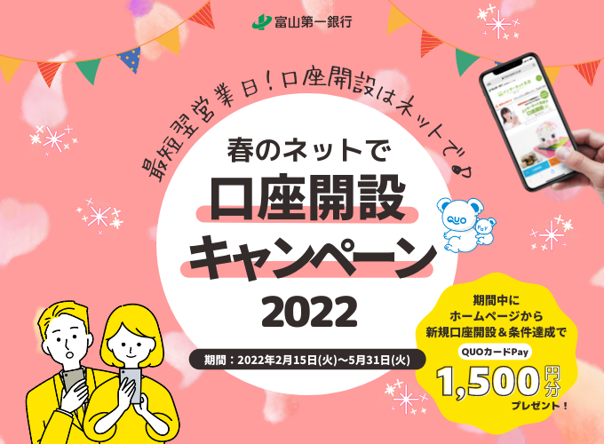 QUOカードPay1,500円分が当たる!「春のネットで口座開設キャンペーン2022」実施のお知らせキャンペーン・セミナー富山第一銀行。