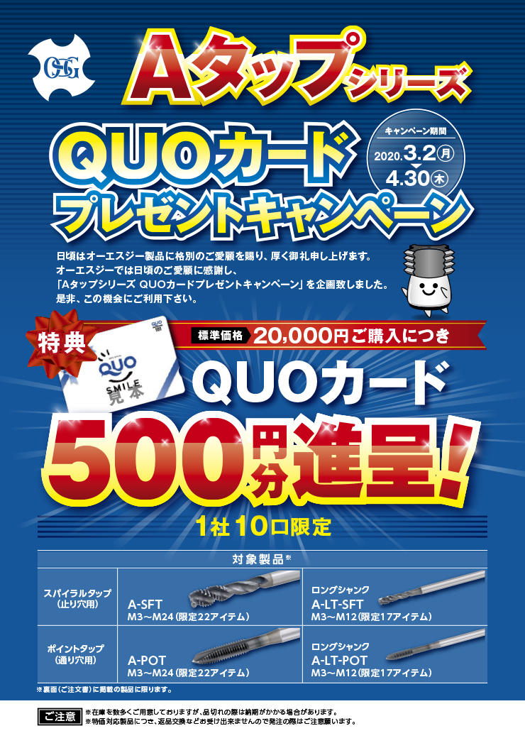 期間限定キャンペーンのお知らせ 終了しましたNEWSオーエスジー:タップ、ドリル、エンドミル等の切削工具メーカーオーエスジ。