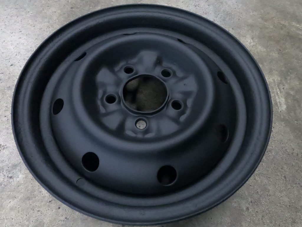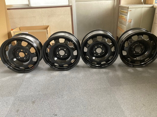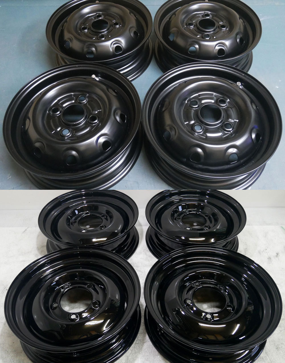 鉄チンホイールの1コートパウダーマットブラック&2コートパウダーハイグロスブラックフルパウダーコート仕上げ実績・ブログ有 オートサービス西 ホイール修正 ホイール修理 ホイールリペアー ガリ傷修正・ホイール塗装・ホイールリフレッシュ・ハイパー塗装。