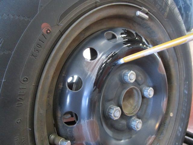 鉄チンホイールの塗装。タイヤを外さないでそのまま塗装する。