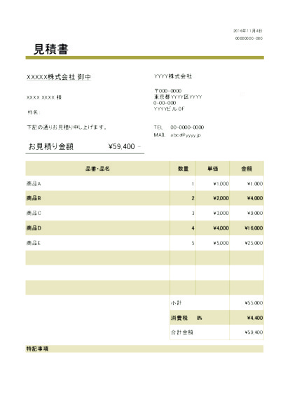 ヨコ型 - 見積書エクセルテンプレート・サンプル 無料。