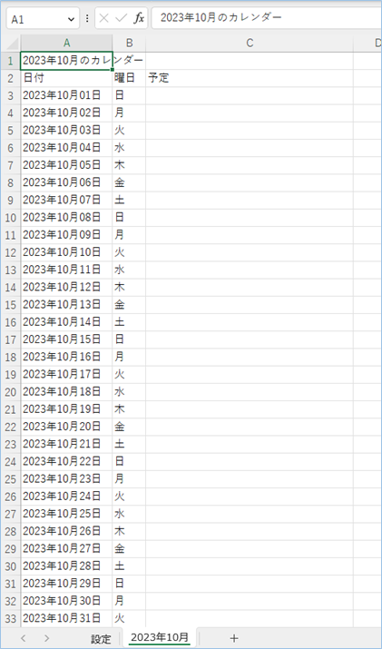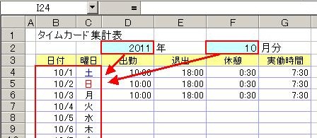 年と月を入力しただけで、1か月分の日付を曜日を自動で表示。