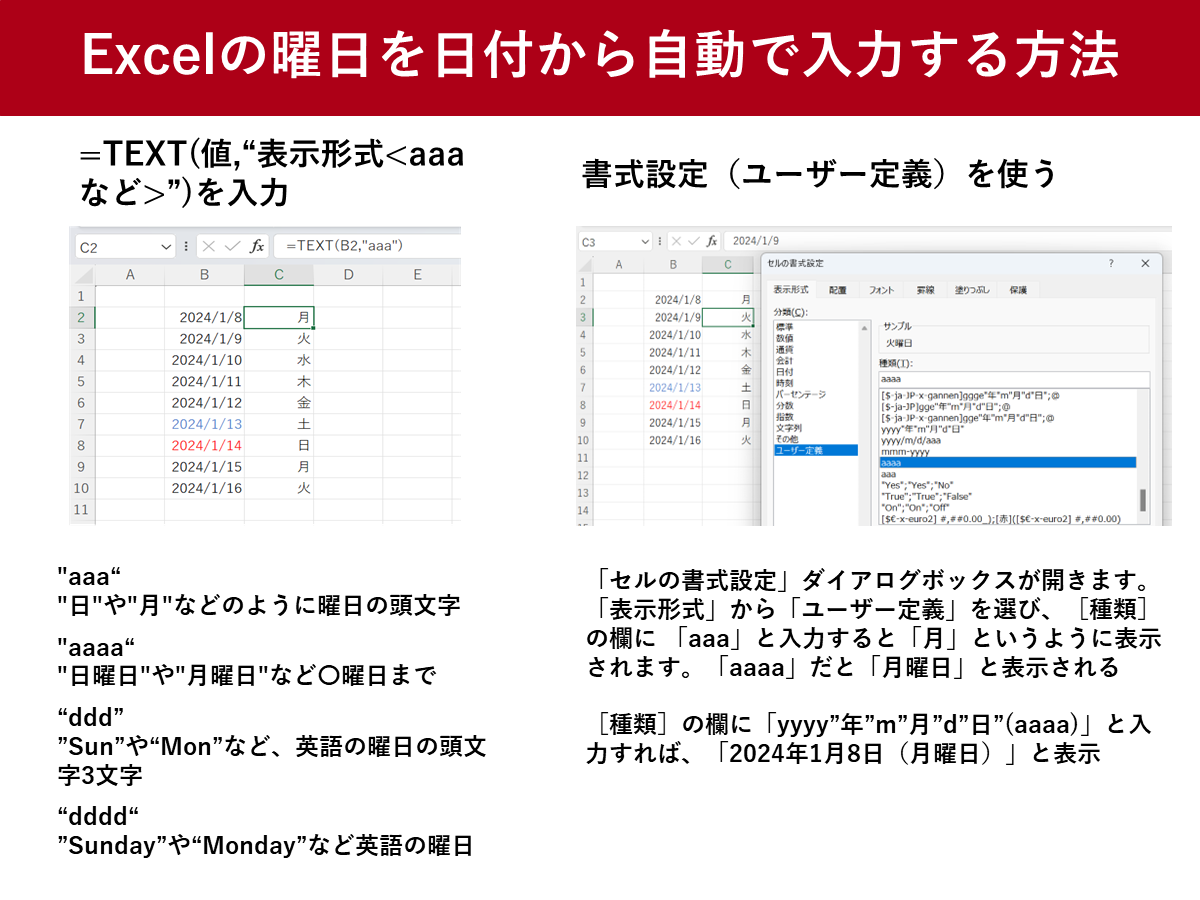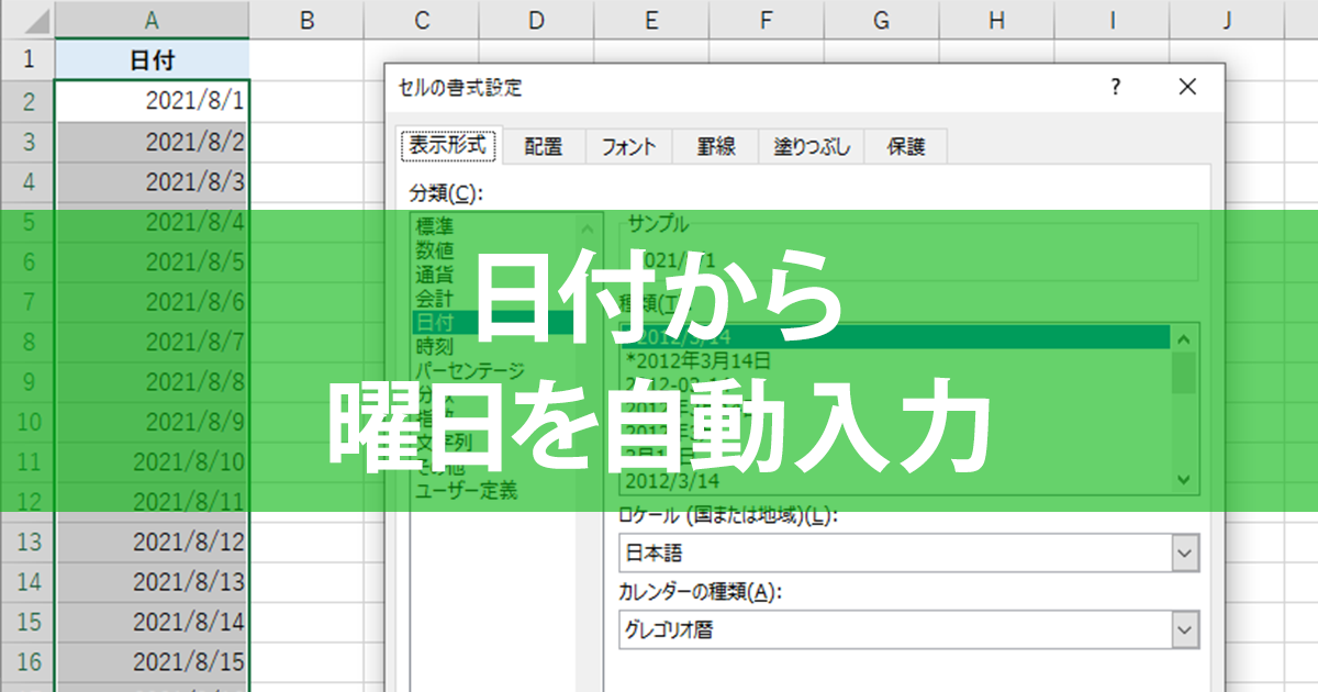 Excelで日付から曜日を自動で表示する方法 書式設定・関数。