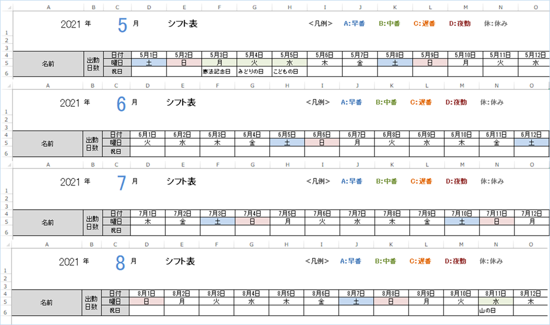 エクセルの勤務シフト表・月別の日付&曜日自動の作り方&使い方が簡単! 月別の日付&曜日自動の作り方&使い方が簡単なエクセ。