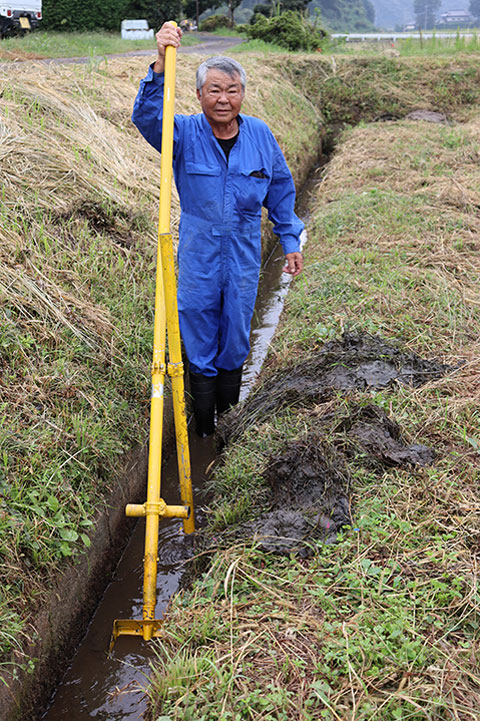 田んぼ 用水路 U字フリュ-ム の掃除。この道具があれば腰への負担も少なく、楽に早く掃除ができます。