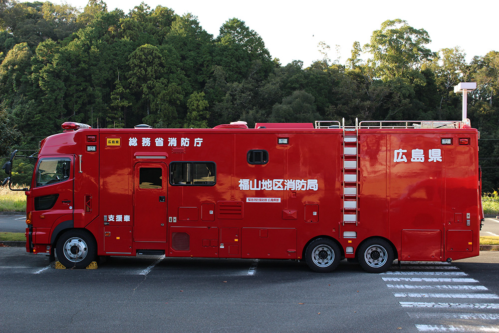支援車Ⅲ型 導入粕屋南部消防組合消防本部令和3年度整備事業として『支援車Ⅲ型』を導入しました。 「緊急消防援助隊後方支援小隊」として、長期化する自然災害等の活動拠点として、隊員のサポートに威力を発揮します。 ※本車両は、「福岡国際空港株式会社 地域。