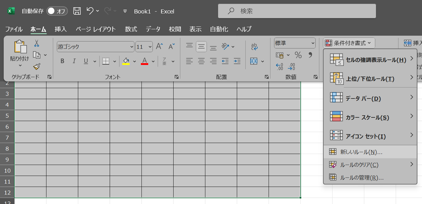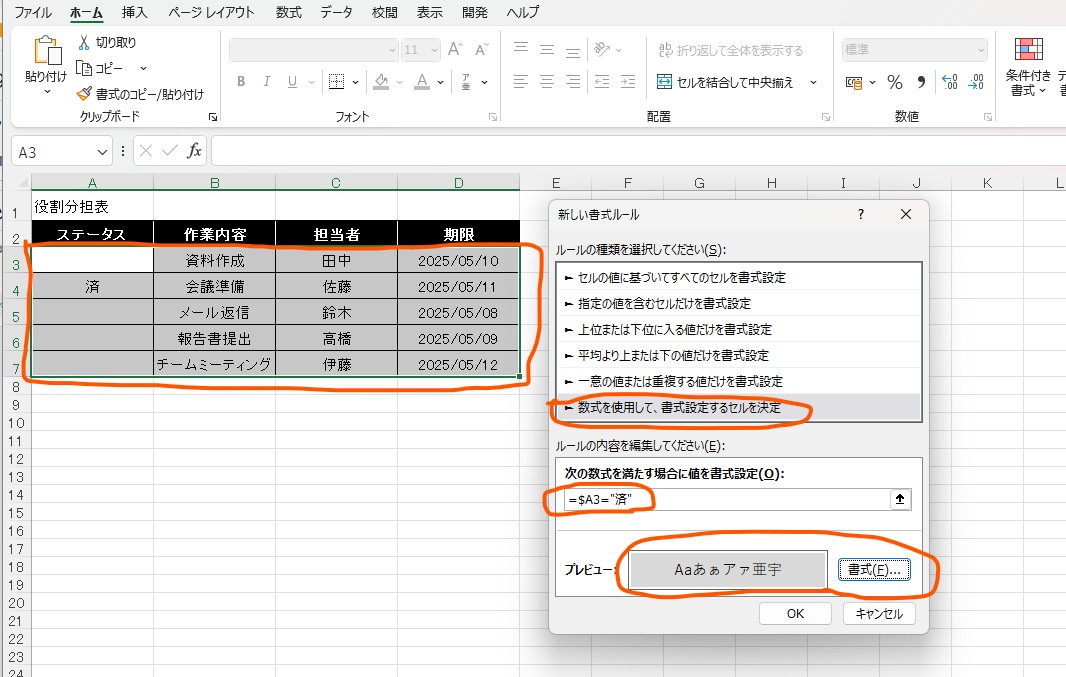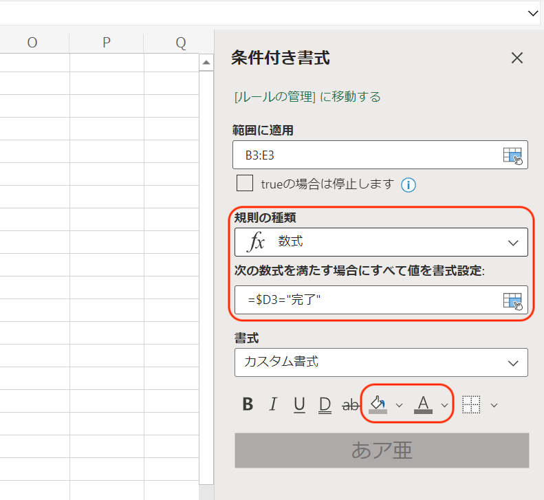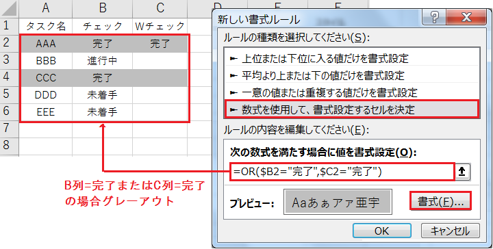Microsoft365のExcelで完了行をグレーアウトする方法 条件付き書式。
