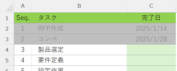 エクセルで完了日の日付を入力した行をグレーアウトする方法。