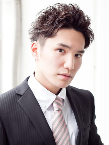 オールバックパーマでビジネスマンスタイル。