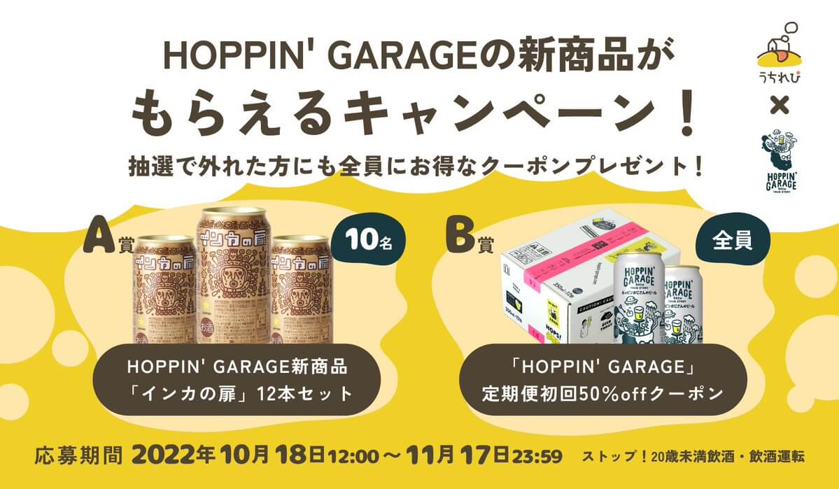 飲料・食品、カジュアル、にぎやか・ポップ、イラスト、切り抜きのバナーうちれぴアプリダウンロードでHOPPIN' GARAGE新商品「インカの扉」12本セットがあたるBANNER LIBRARY。