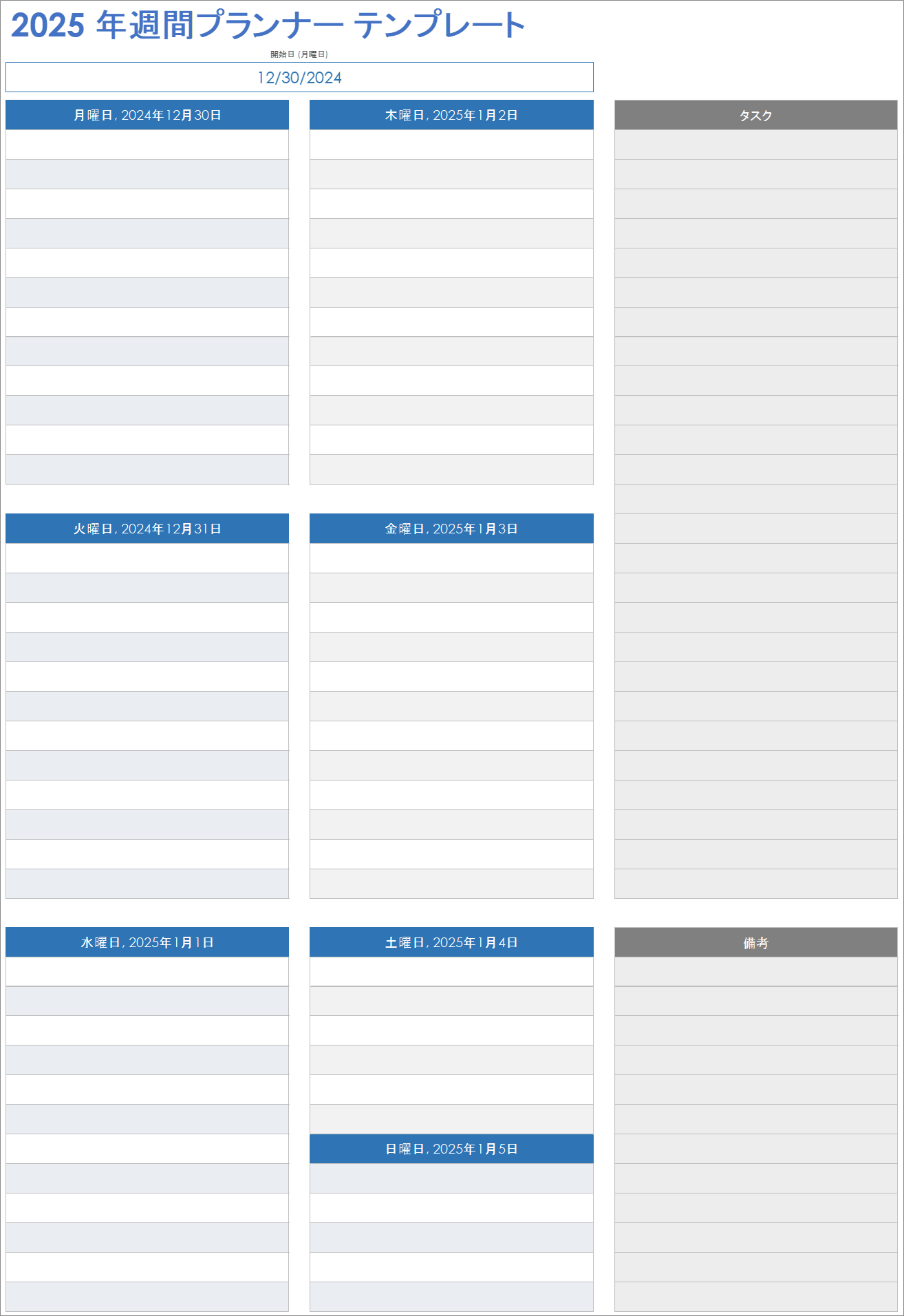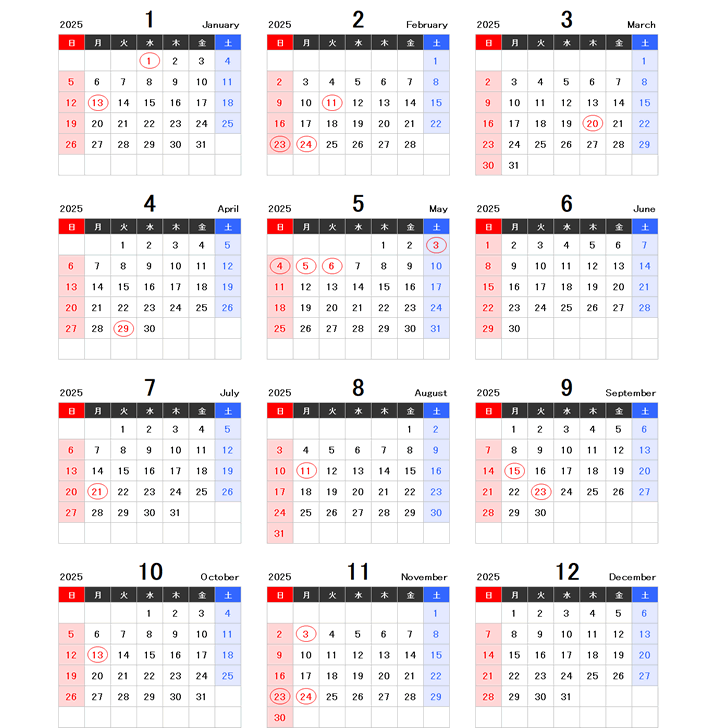 2025年カレンダーExcel作成の月曜始りと日曜始りの2書式を無料ダウンロード。