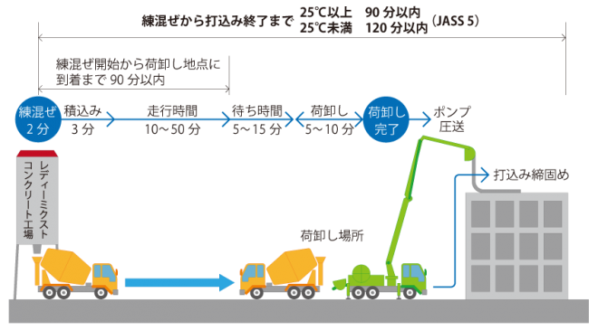 コンクリートの運搬とは?1分でわかる意味、方法と車、時間と90分、120分の関係。