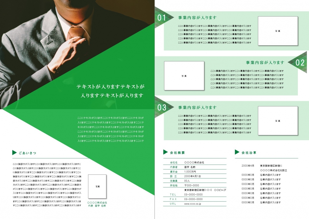 ビジネス系会社案内パンフレットテンプレート No.019 緑色チラシテンプレートセンタ。