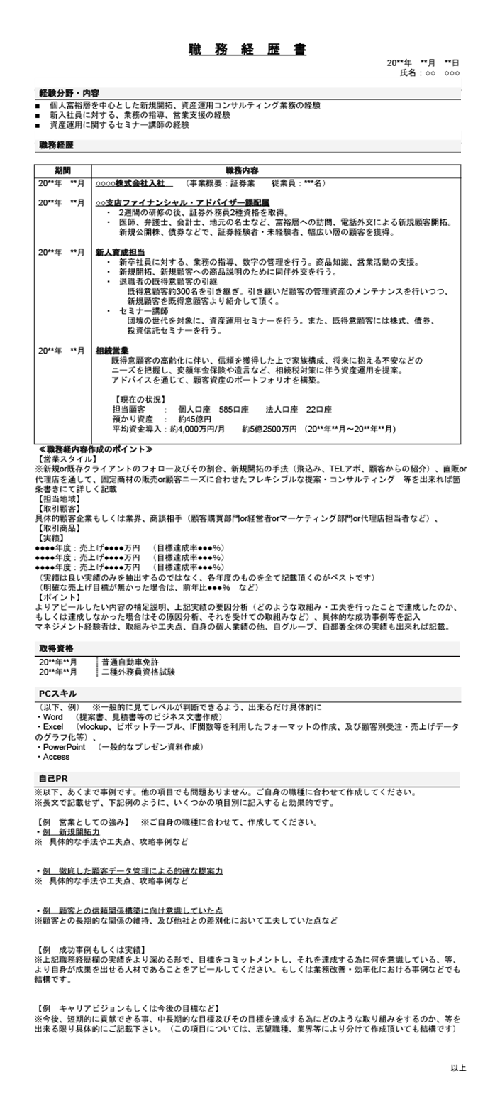 金融営業職 個人営業 の職務経歴書の書き方見本&フォーマットテンプレートダウンロード パソナキャリア パソナの転職エージェント。