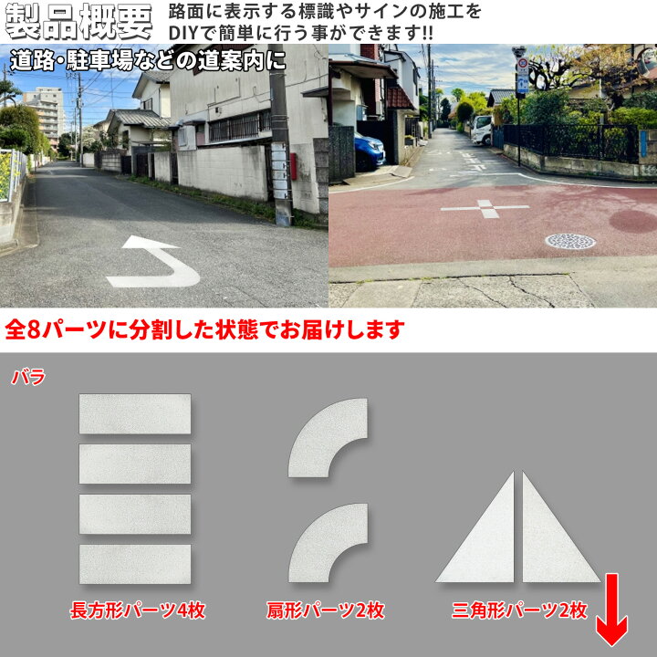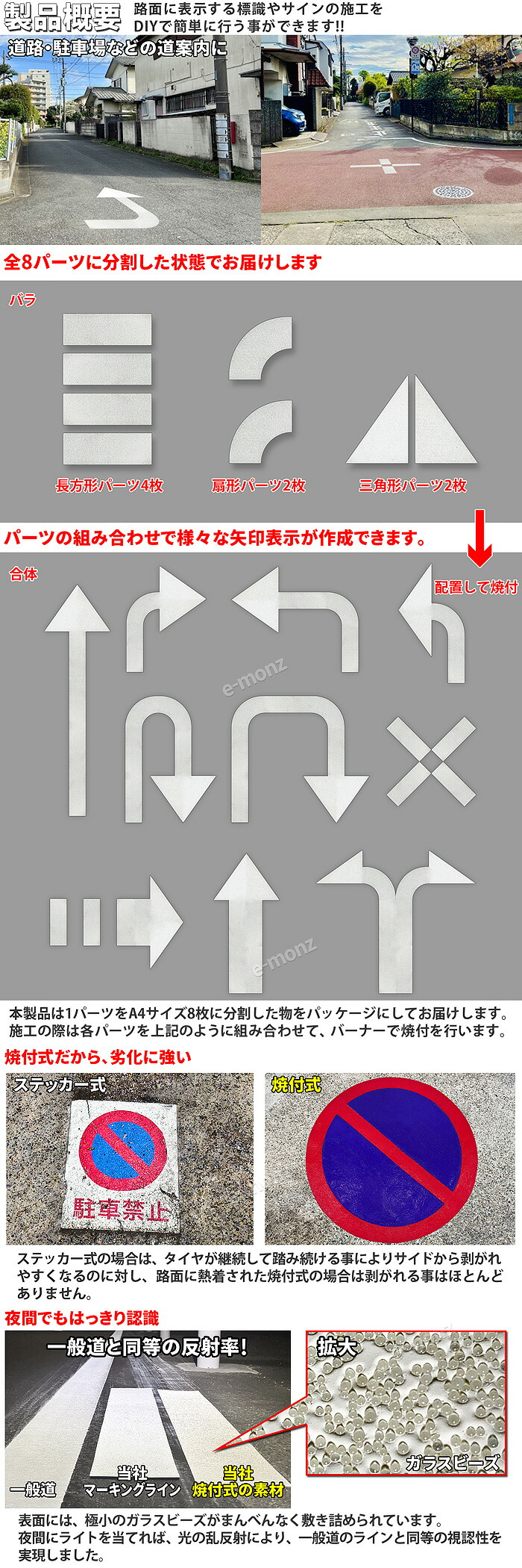 路面標示材 ロードマーキング サイン矢印 マーク 白焼付式 反射材 ガラスビーズ 路面標示 路面サイン 道路標示 指示標示 規制標示 標示文字 DIY 施工 注意喚起 安全対策 おすすめeモンズ。