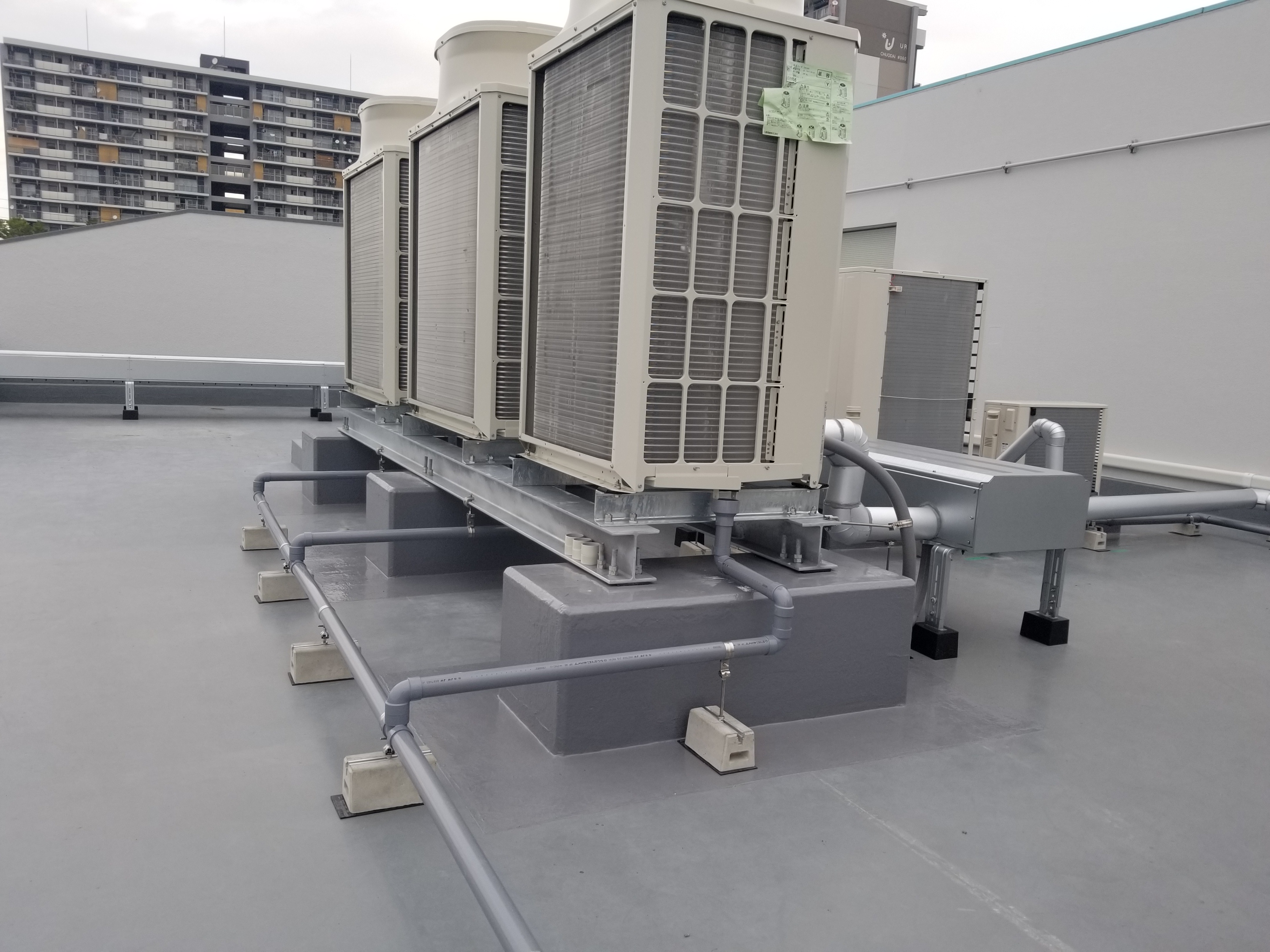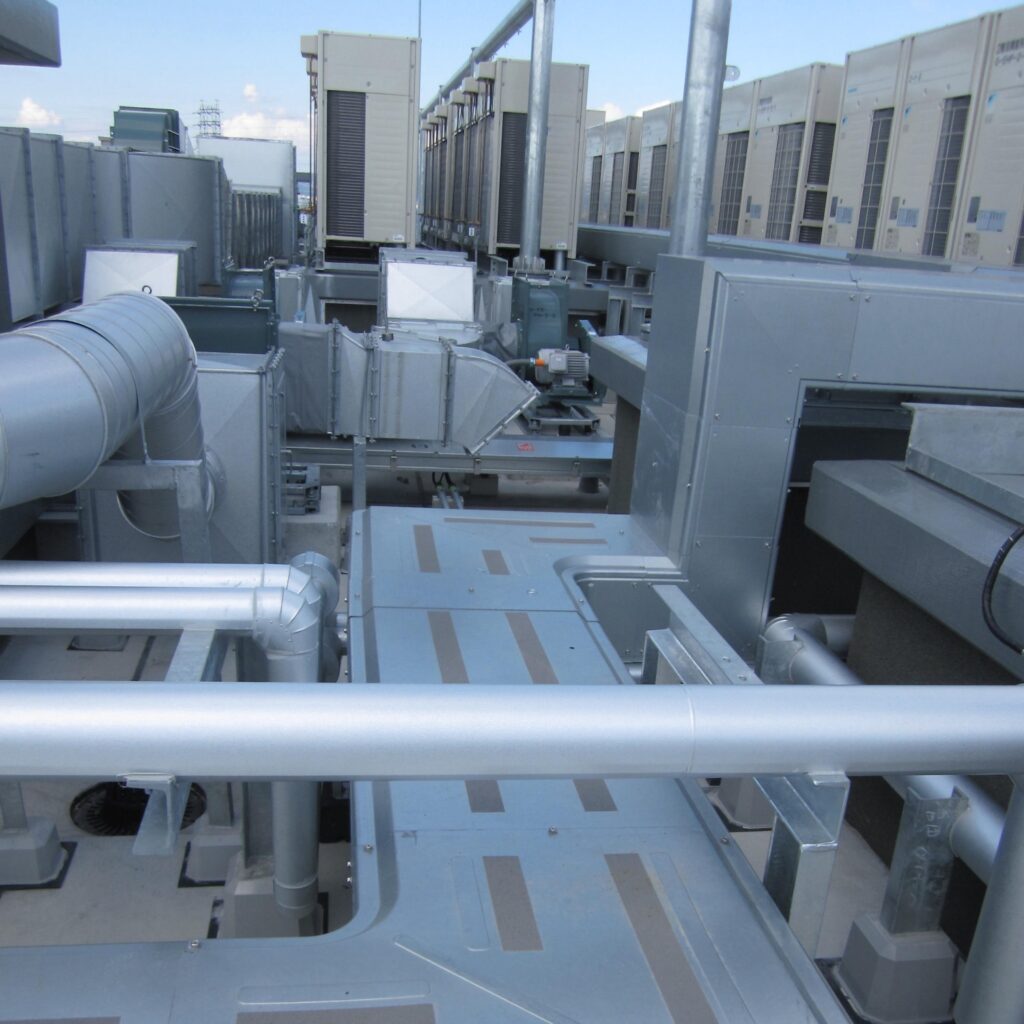 スカイダクトTRシリーズで、ビルの屋上配管を整理して収納!保守性、施工性が向上 – 空調施工の現場。