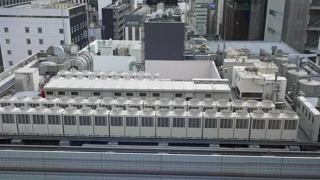 Compressor Units on the Roof ビル空調・屋上エアコン室外機の回るファン 上から- YouTube。