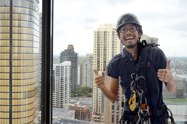 ビルの屋上からロープ1本で窓掃除をするアブセーラー 山口晃平さん 29歳JAMS.TV オーストラリア生活情報ウェブサイト。
