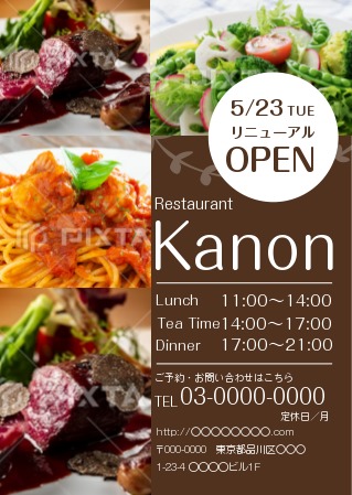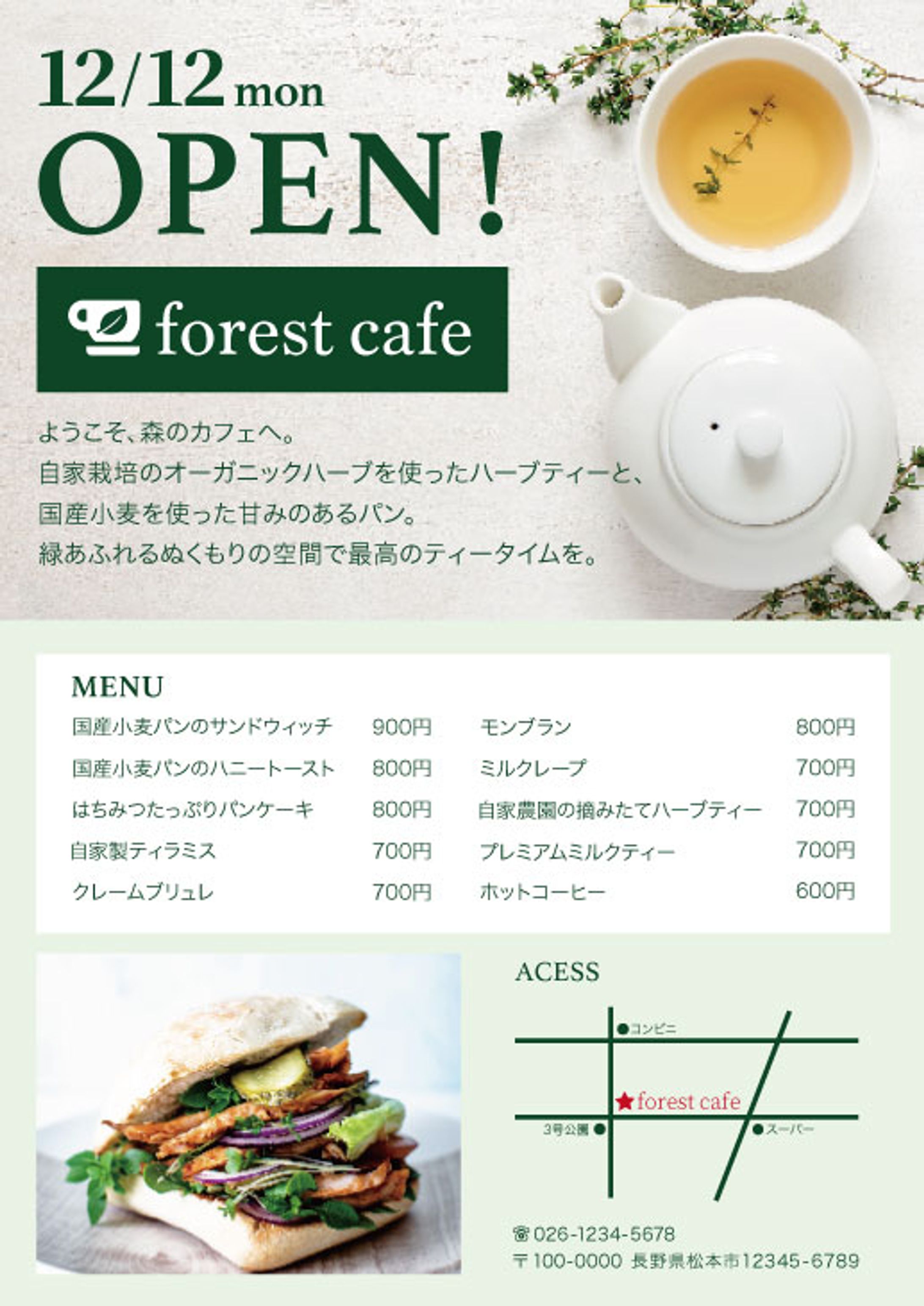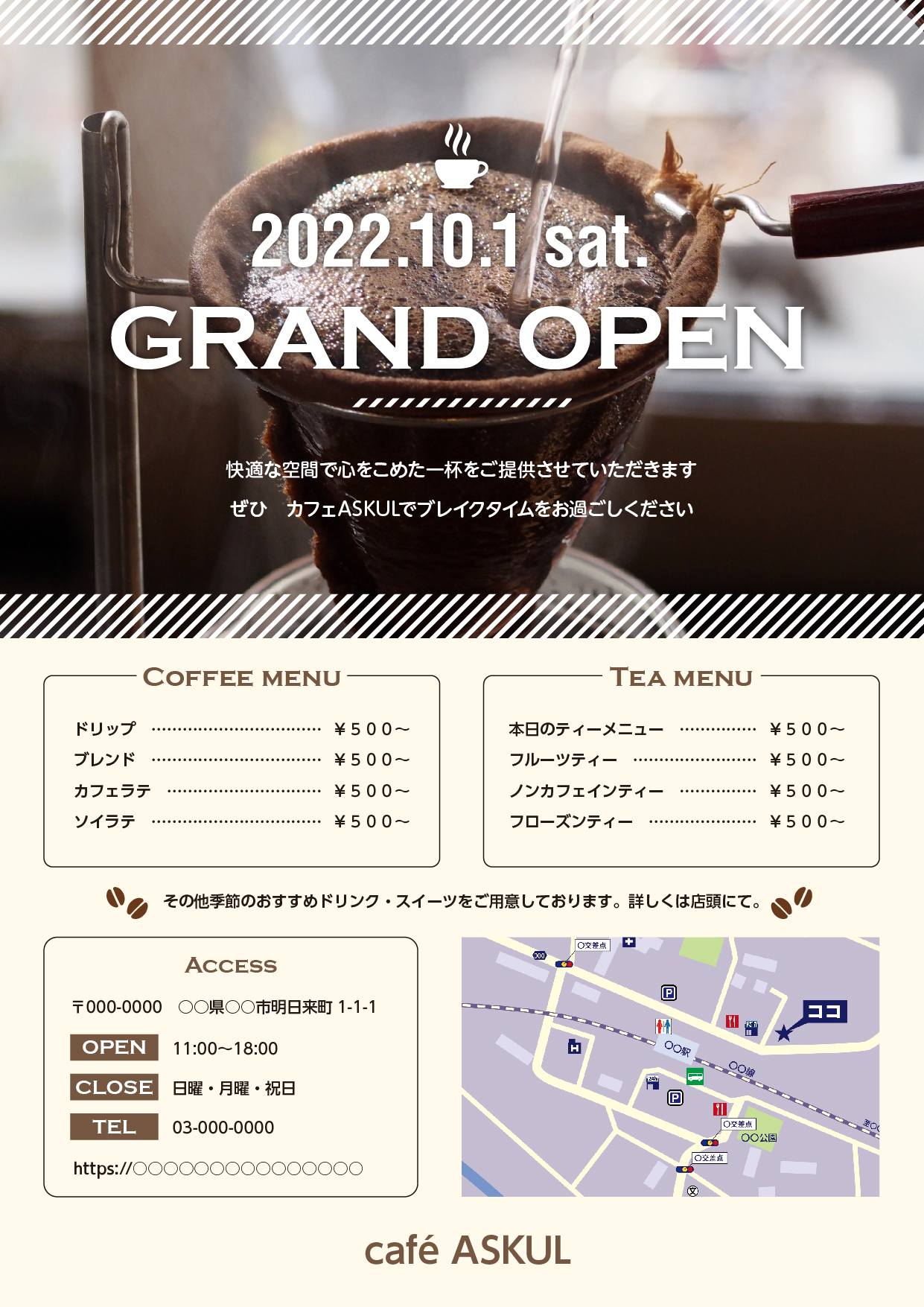 飲食_A6縦_カフェ_オープン_1034のチラシ・フライヤー無料デザインテンプレート印刷のラクスル。