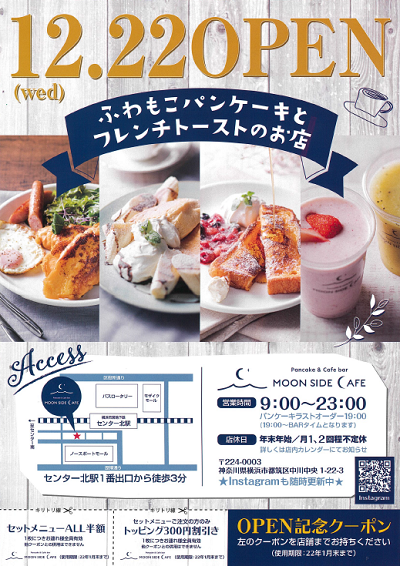 都筑区センター北に12月22日にオープンする「パンケーキ&カフェバー MOON SIDE CAFE」で「オープン記念半額クーポンチラシ」配布中!うちの街 都筑。