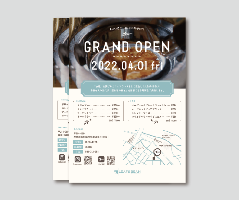 LEAF&BEANのオープンチラシを制作いたしました!株式会社LAKA。