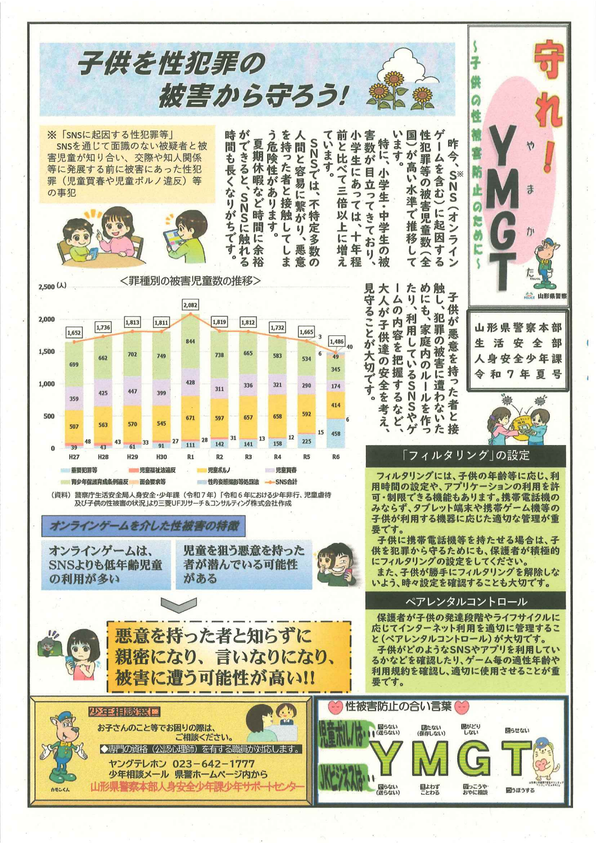 山形県警からのお知らせ~守れ!YMGT やまがた令和7年夏号 ~ 雛とべに花の里・河北町。