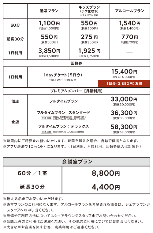 重要 料金改定のお知らせ SHARE LOUNGE シェアラウンジ - 時間制カフェラウンジ&コワーキングスペース。