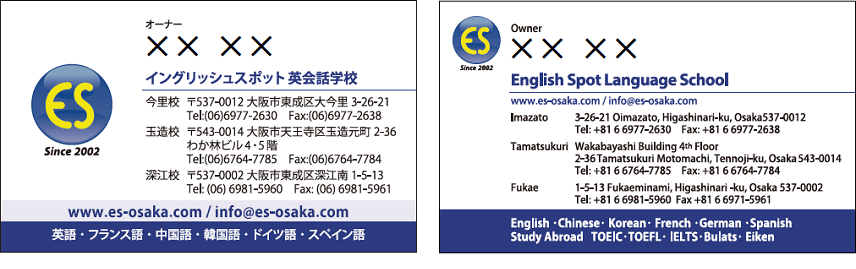 英会話教室の名刺作成・名刺デザインは大阪のオフィスSASAJIMAへ。