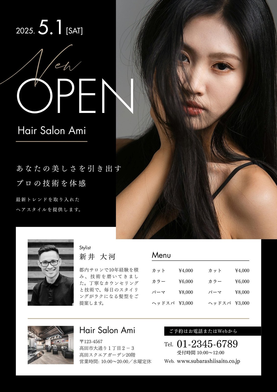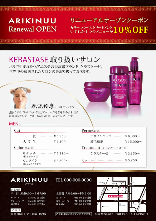 高級感のある美容室の開店チラシアリキヌ:チラシ制作部。