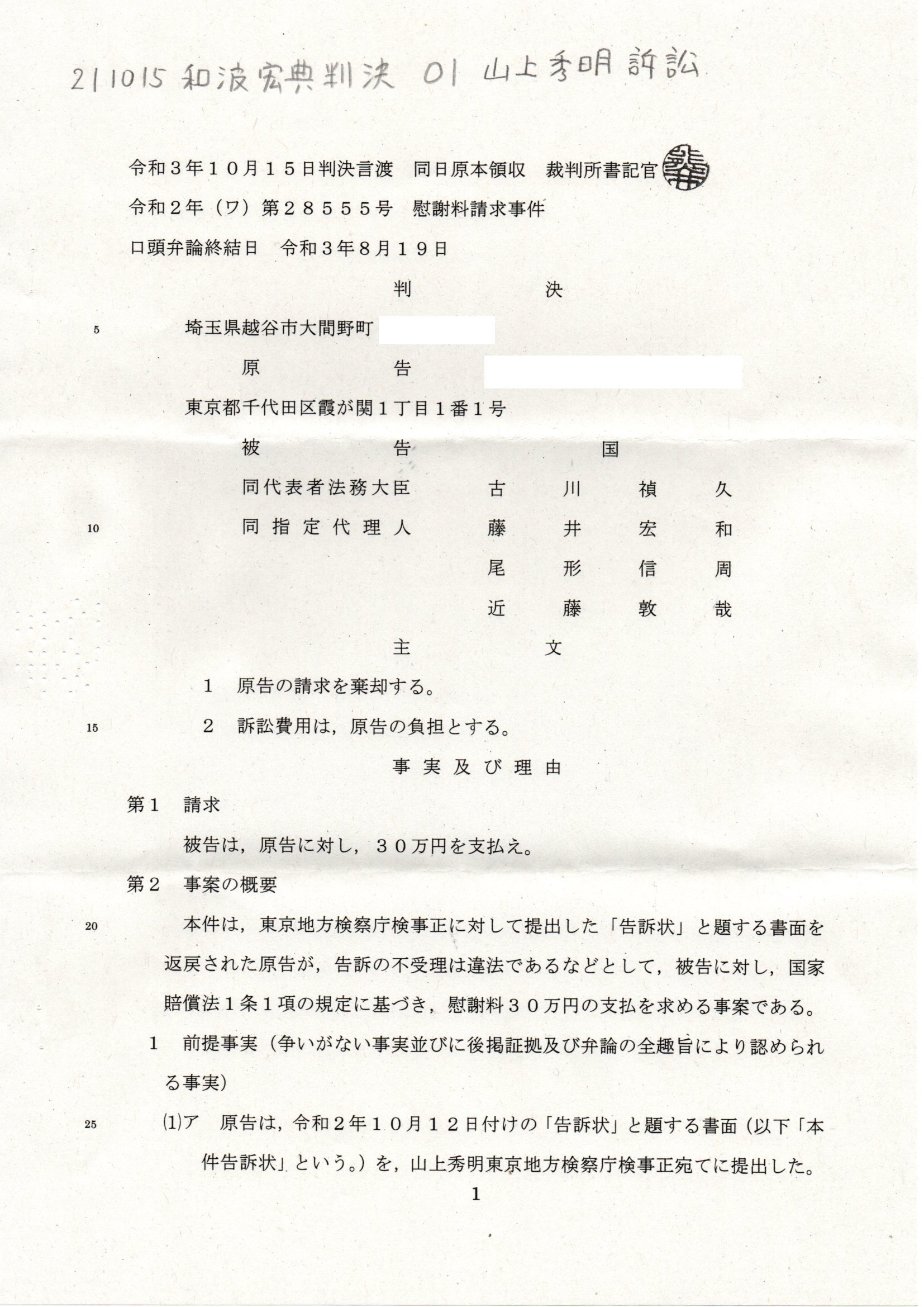 YH 211015和波宏典判決山上秀明訴訟和波宏典裁判官梶浦義嗣裁判官浅井彩香裁判官山上秀明検事正告訴状返戻thk6481。