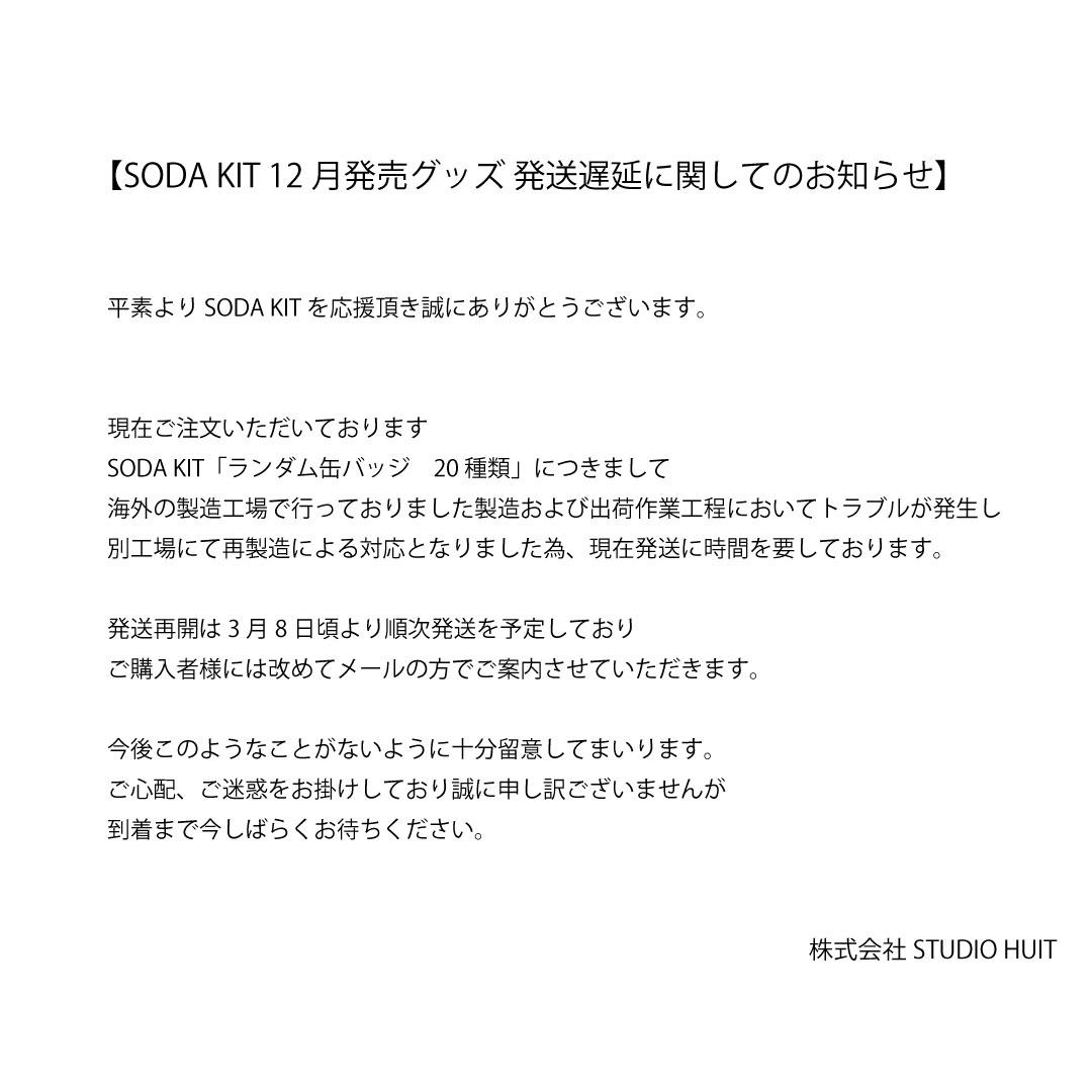 SODA KIT🫧活動休止中 on X: " SODA KITグッズ発送遅延に関してのお知らせ一部販売グッズにおける製造トラブル発生の為、現在別工場にて再製造による対応となり、商品発送に遅れが生じております。 お待ちいだいている皆様には、大変申し訳ございませんが、商品ご到着。