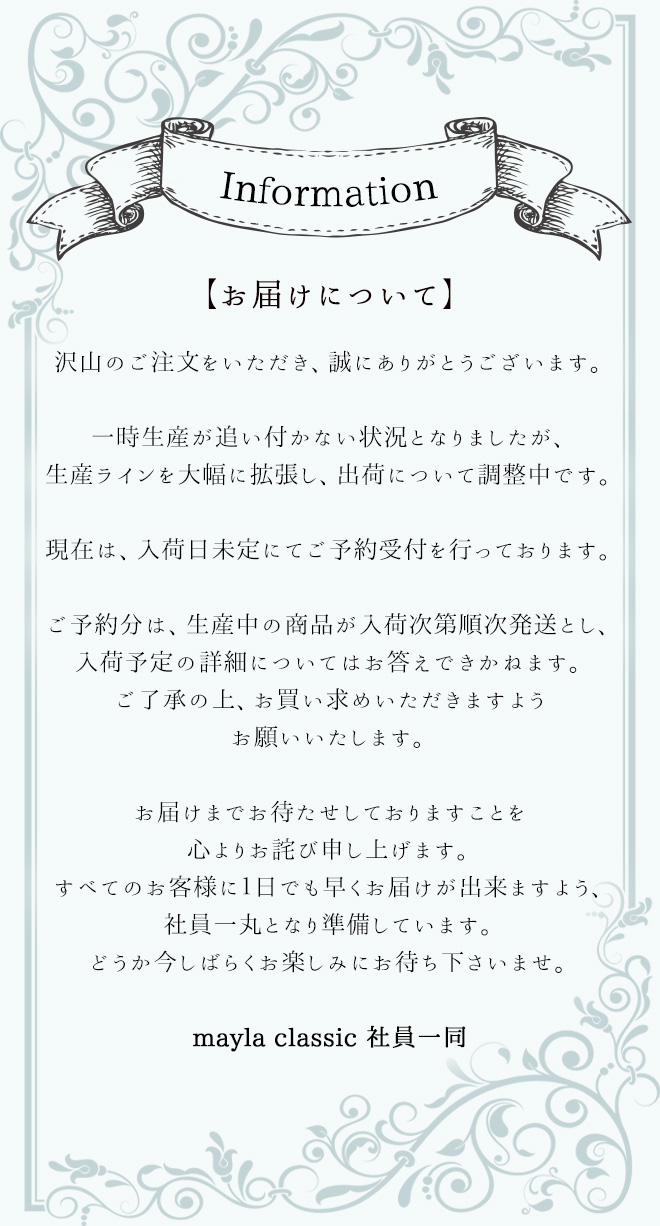 MAYLA on X: "お待ちいただいております皆さまに 少しでも具体的な目安をお伝え出来ればと思い、 ページ上に現在の発送状況を更新いたしました。あくまで目安ではございますが、 今後は随時、ページ上でもご案内させていただきます。 今しばらくお待ち下さい✨ 皆さまが。
