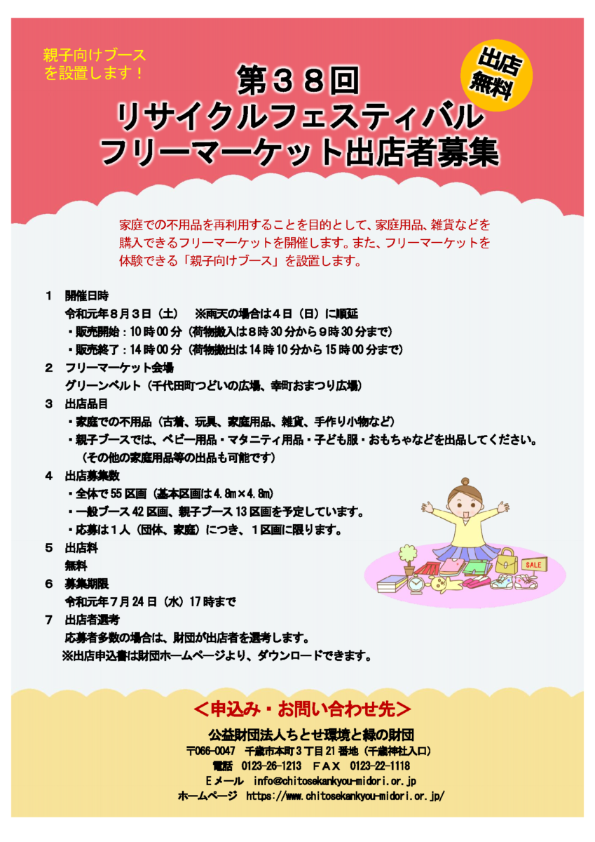 第38回リサイクルフェスティバル・フリーマーケット出店者を募集します。公益財団法人 ちとせ環境と緑の財団。