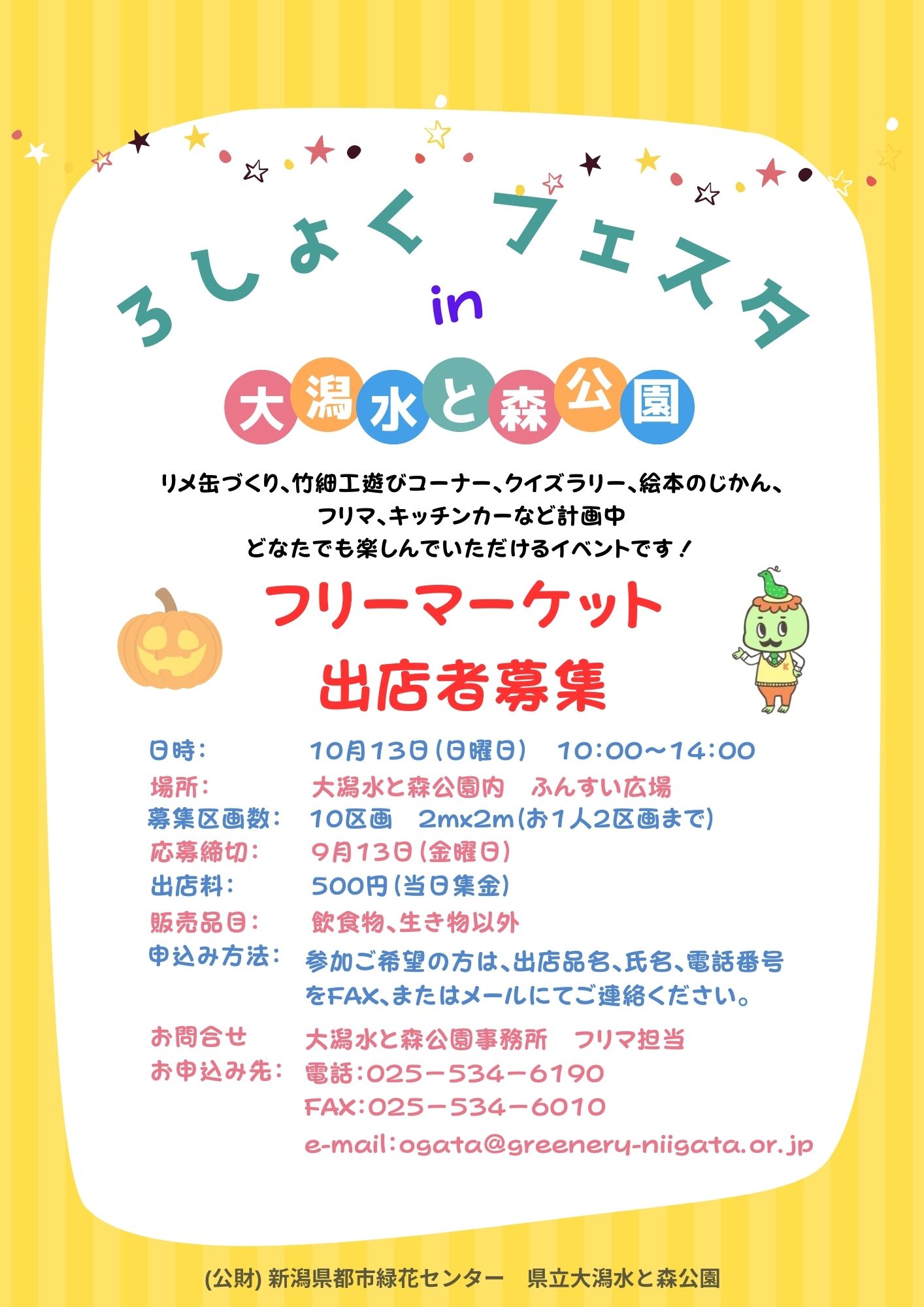 令和6年10月13日 日曜日 開催予定 3しょくフェスタ でのフリーマーケット出店者募集!新着情報新潟県立 大潟水と森公園。