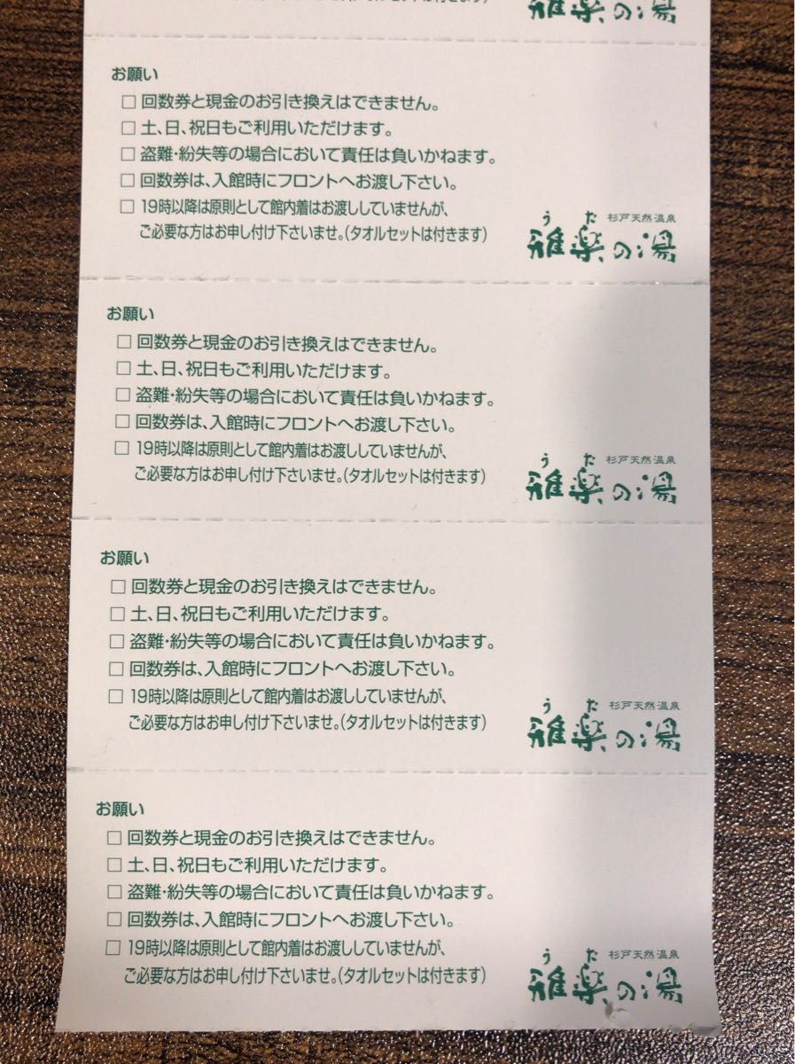 杉戸天然温泉雅楽の湯 うたの湯 スーパー銭湯 回数券。