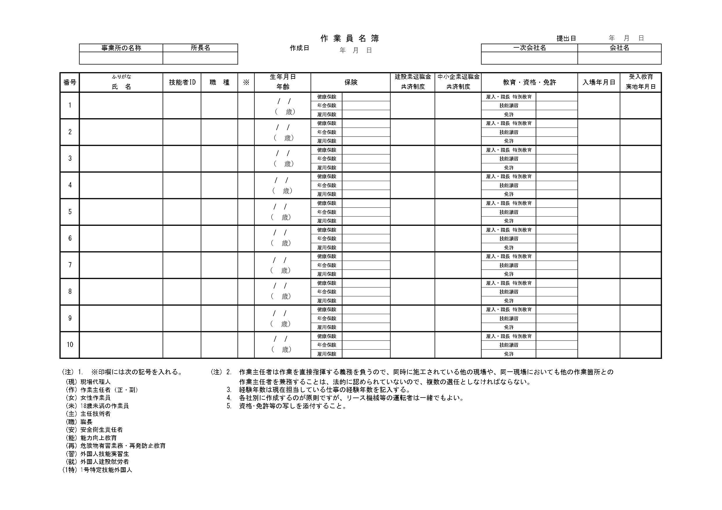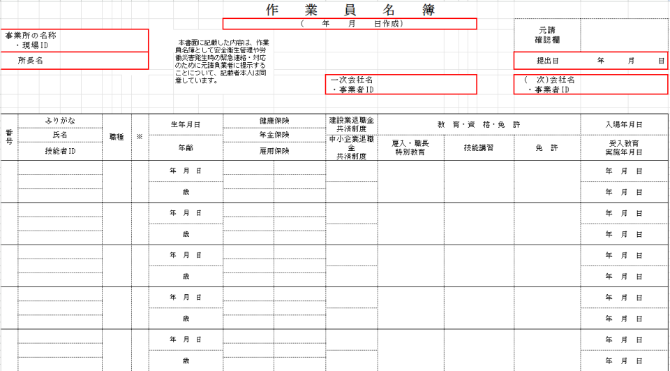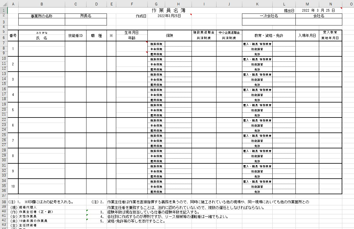 記入例 作業員名簿の書き方とは?項目や注意点、エクセルテンプレートもご紹介。