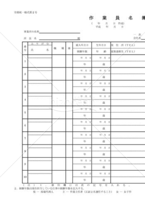 作業員名簿 全建統一様式第2号 bizocean ビズオーシャン。