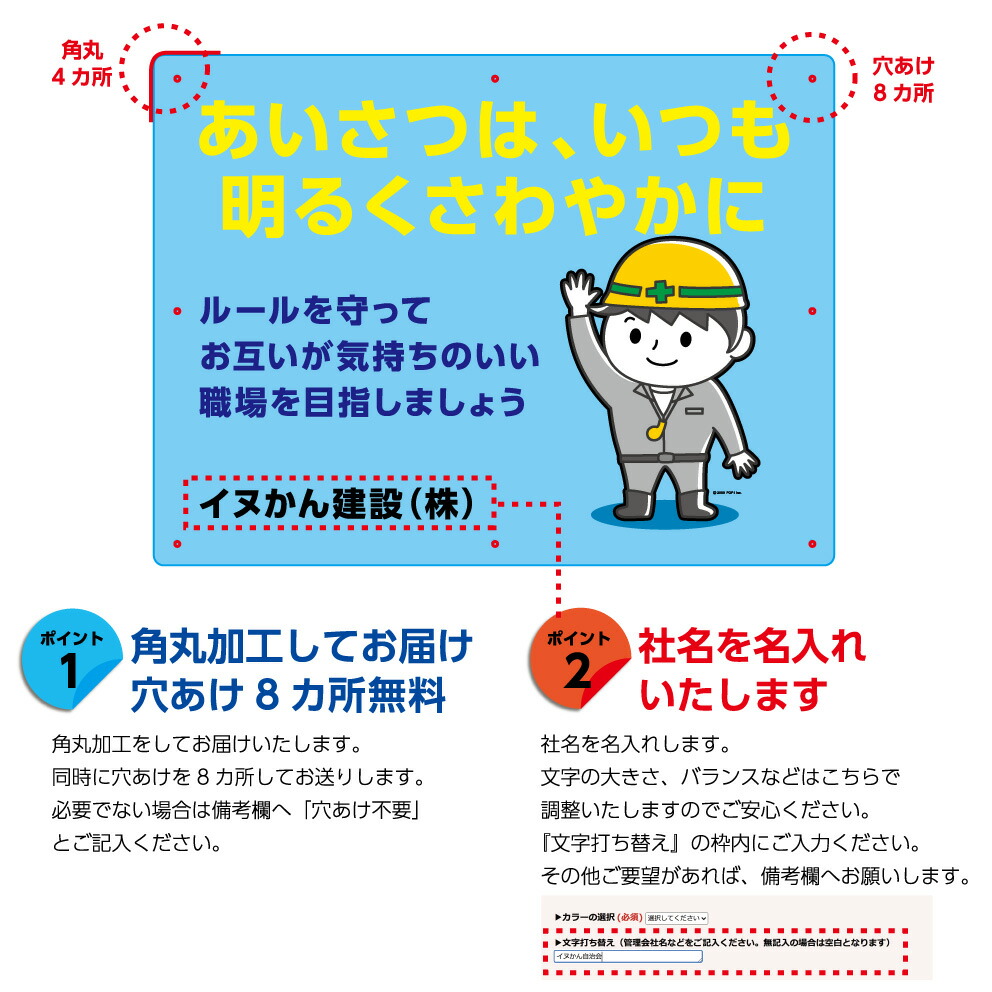 挨拶 挨拶をしましょう 挨拶運動 看板 プレート 工事現場 作業現場 パネル 業務用 標識 標語 あいさつは いつも明るく 爽やかに ルール 職場環境良くする W600×H450mm イラスト 目立つ わかりやすい シンプル 注意喚起 結束バンド付 選べる 緑 白イヌのかんばんや。