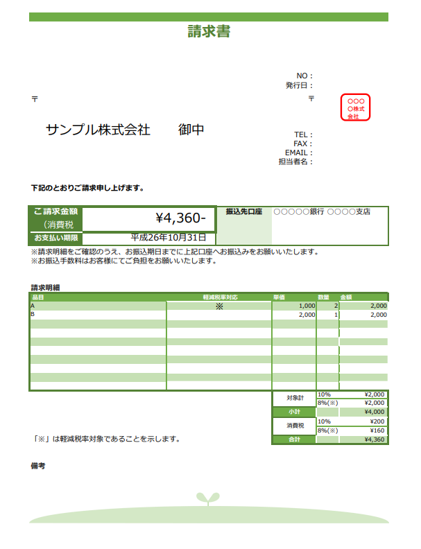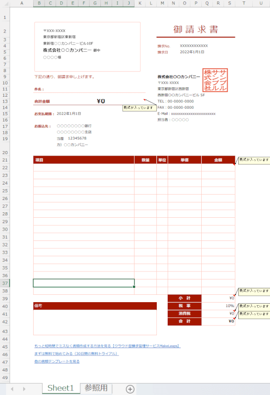 登録不要・無料で使える請求書エクセルテンプレート サンプル 、作成・書き方。