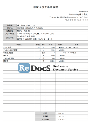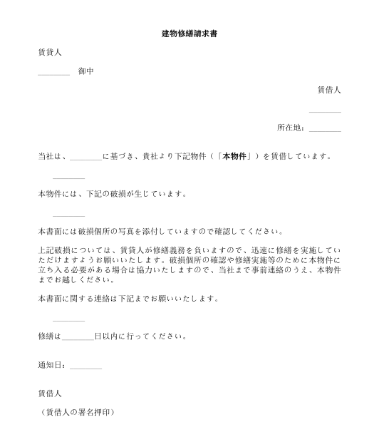 建物修繕請求書 - テンプレート、WordとPDF形式で記入するサンプル文書。