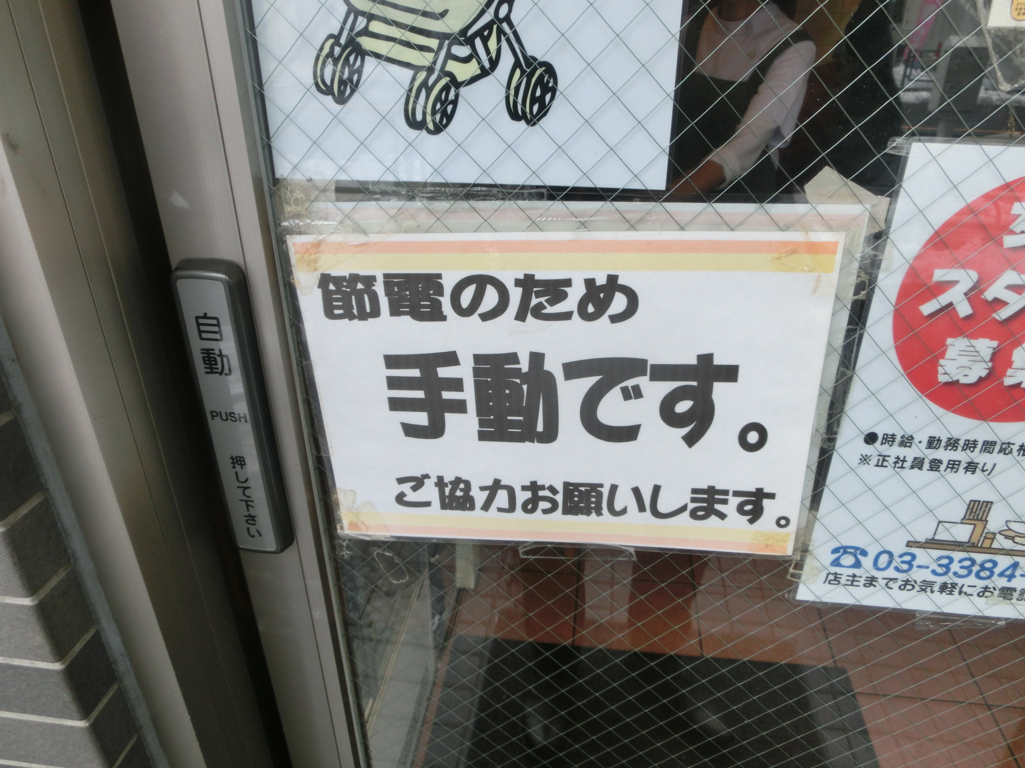 停電中のため自動ドアは手で開けて下さいの貼り紙フリー貼り紙のペラガミ.com。