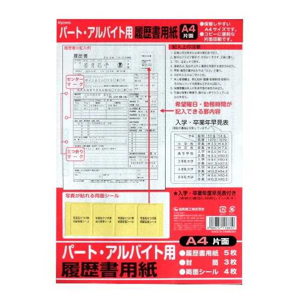 パート・アルバイト用履歴書B5片面履歴書用紙5枚封筒6枚両面接着シール8片日本製キャンドゥ上質紙 最低価格。