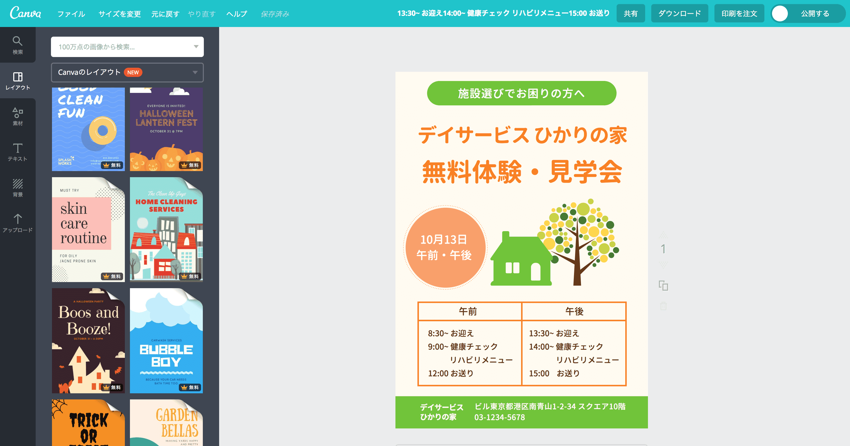 デイサービスチラシや介護施設、放課後デイサービスなどのチラシ作成から印刷まで!簡単に手作りできるAI搭載の無料アプリCanva キャンバ。