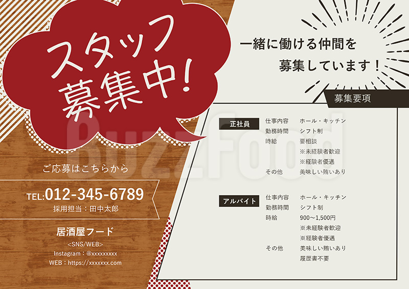 飲食店のチラシ無料テンプレート・デザインサンプル求人・アルバイト募集 - ネット印刷グラフィック。